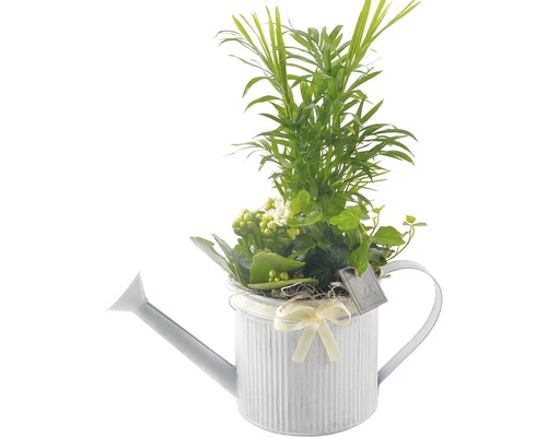 Darum solltest Du zugreifen: Zu der erfrischenden Mischung aus Kalanchoe, Chamaedorea und Hedera gesellt sich als schmückendes Beiwerk der flotte Gießkannenübertopf. In dieser Konstellation erntet das Arrangement, ob es will oder nicht, positiven Beifall. Dazu tragen übrigens auch die ganzjährigen weißen Blüten einen wesentlichen Teil bei. Als Zimmerpflanze lockert das Gießkannen-Ensemble dabei nicht nur Deine Wohn-, sondern auch Büro- und andere Arbeitsräume ganz natürlich auf.