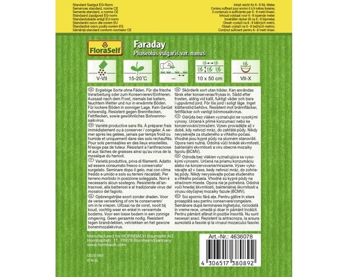 | Gebrauchsanweisung | Ergiebige Sorte ohne Fäden. Geeignet für die frische Verarbeitung oder zum Konservieren/Einfrieren. Aussaat nur nach dem Frost, niemals bei kaltem, feuchtem Wetter und nur in erwärmte Böden. Für lockere Böden in sonniger Lage. Kein Gerüst notwendig. |