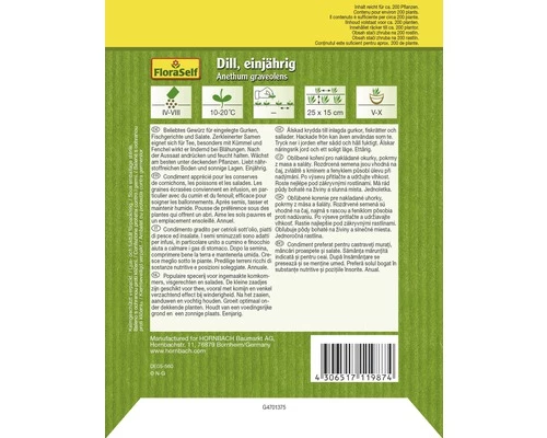 Dill ist ein beliebtes Gewürz für eingelegte Gurken, Fischgericht und Salate. Sein zerkleinerter Samen eignet sich für Tee, besonders mit Kümmel und Fenchel wirkt er lindernd bei Blähungen. Nach der Aussaat sollten Sie ihn andrücken und feucht halten. Der einjährige Dill wächst am besten unter deckenden Pflanzen und liebt einen nährstoffreichen Boden in sonniger Lage.
