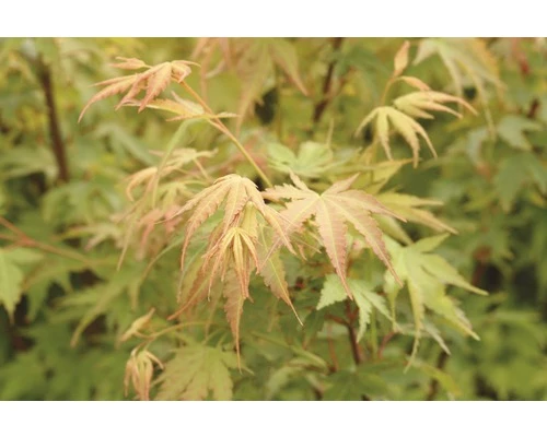 Das Besondere an diesem Fächer-Ahorn ist das rötliche Schimmern der Rinde durch das grüne Laub. Das austreibende Laub hat zudem einen rötlichen Rand.