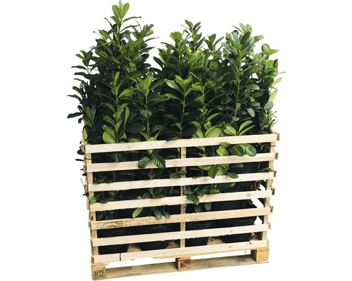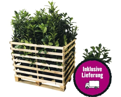 Mit dem Kirschlorbeer „Caucasica“ haben Sie eine beliebte und dekorative Heckenpflanze – und das in großen Mengen. Die pflegeleichte Pflanze sorgt in kurzer Zeit für einen immergrünen Blickschutz.