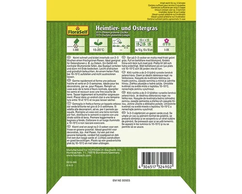 Das Heimtier- und Ostergras keimt schnell und bildet innerhalb von 2 bis 3 Wochen einen frischgrünen Rasen, daher eignet es sich ideal für Dekorationen, z. B. zu Ostern. Füllen Sie ein Gefäß mit normaler Blumenerde, verteilen Sie das Saatgut, bedecken es dünn mit Erde, drücken es leicht an und befeuchten Sie es gründlich. Stellen Sie das Gefäß an einem hellen Platz bei 10 bis 15°C auf und lassen Sie die Erde nicht austrocknen.