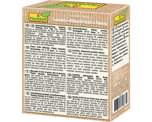 Diese Packung enthält 100 g Sommerblumensamen von FloraSelf Nature, aus denen in kürzester Zeit einjährige, bis zu 80 cm große Blühpflanzen werden.