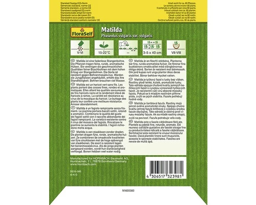 Matilda ist eine fadenlose Stangenbohne. Die Pflanzen tragen feine, runde, aromatische Hülsen. Sie vereinen die geschmacklichen Qualitäten feiner Buschbohnen mit dem hohen Ertrag von Stangenbohnen. Die Sorte ist resistent gegen Bohnenmosaikvirus. Werden die Jungpflanzen angehäufelt, erhöht das ihre Standfestigkeit. Bohnen brauchen viel Wasser.