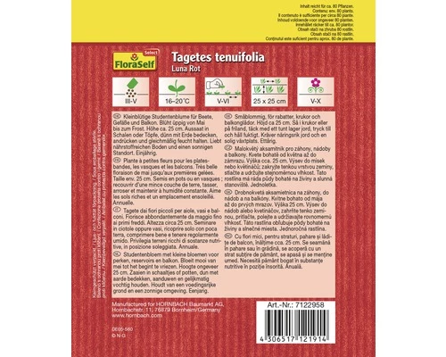 Dies ist eine sehr reich und ausdauernd blühende, kleinblütige Tagetes, deren mahagonifarbenen Blüten besonders intensiv leuchten. Die Pflanzen wachsen reich verzweigt und kugelig, bei flächiger Pflanzung auch als dichter Teppich mit ca. 25 cm Höhe. Die Aussaat erfolgt in Schalen oder Töpfe, die Samen werden dünn mit Erde bedeckt, angedrückt und gleichmäßig feucht gehalten. Eine Abdeckung mit Klarsichtfolie bis zur Keimung verhindert ein Austrocknen. Ca. 2 Wochen nach dem Auflaufen werden sie in Töpfe oder Schalen pikiert und hell und luftig bei 14 bis 18 °C weiterkultiviert. Nach den letzten Frösten können Sie sie auspflanzen. Ab Ende April ist eine Direktsaat im Freiland möglich, indem Sie den Samen in flache Rillen säen und gleichmäßig feucht halten.