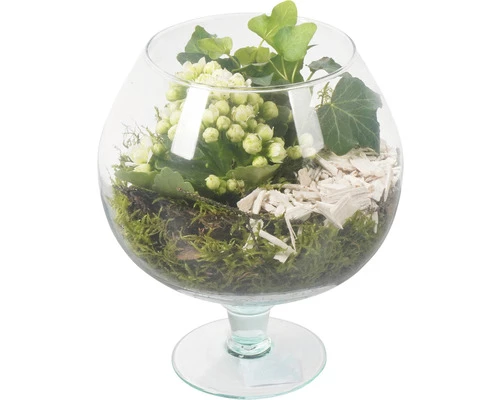 Das Arrangement aus Kalanchoe und Hedera von FloraSelf wird in einer Glasvase mit 17 cm Durchmesser angeboten. Die Höhe inklusive Glas beträgt 23 cm. Als Standort eignen sich halbschattige Plätze und beim Gießen solltest Du Dich zurückhalten.